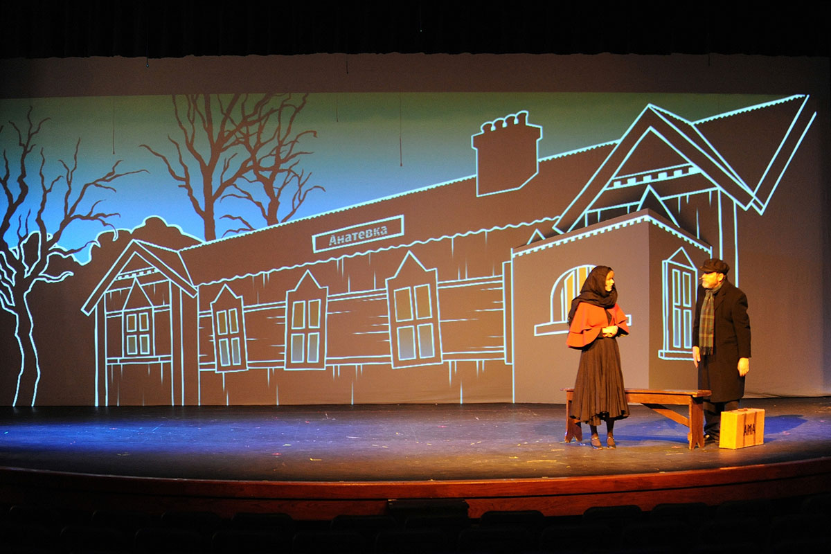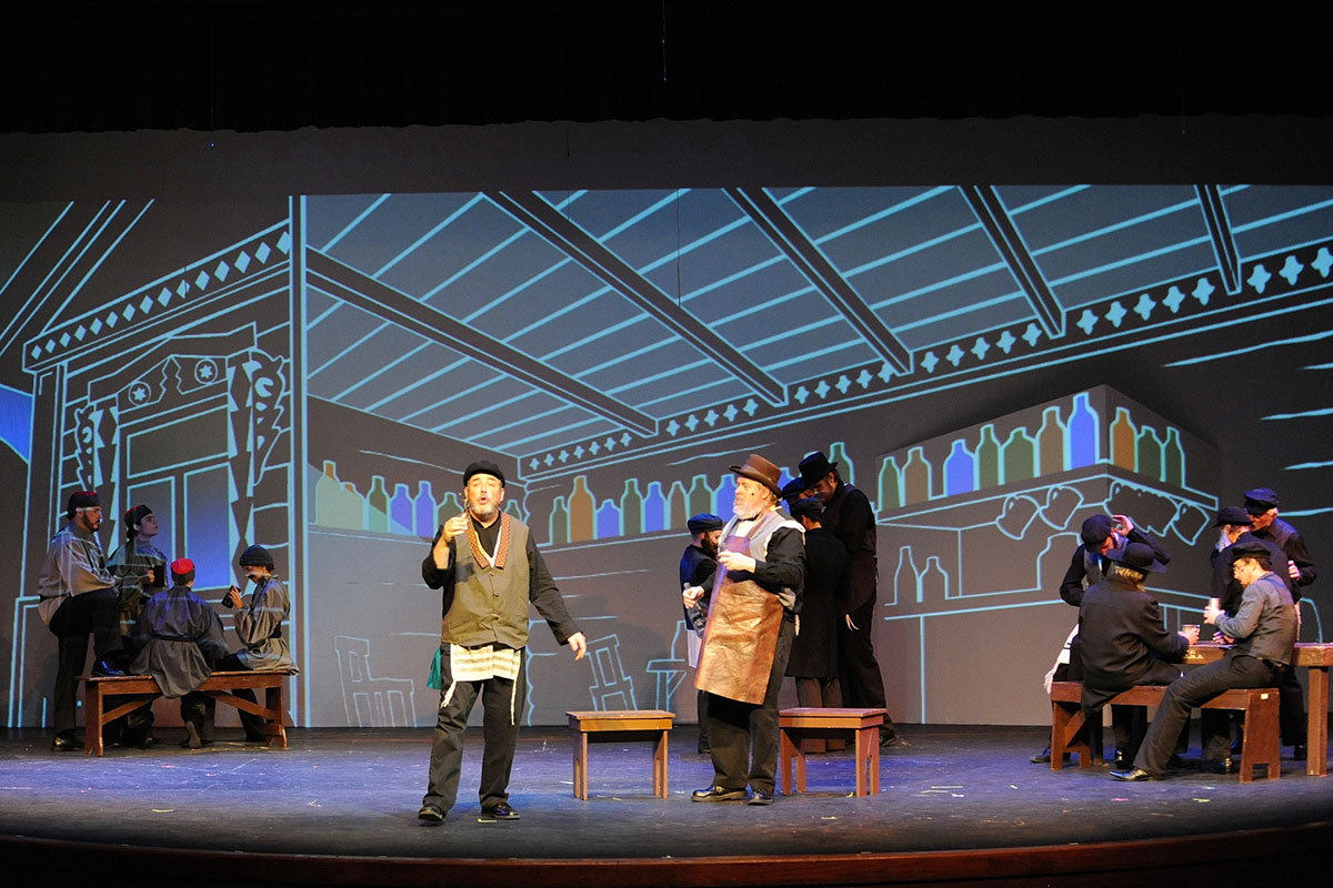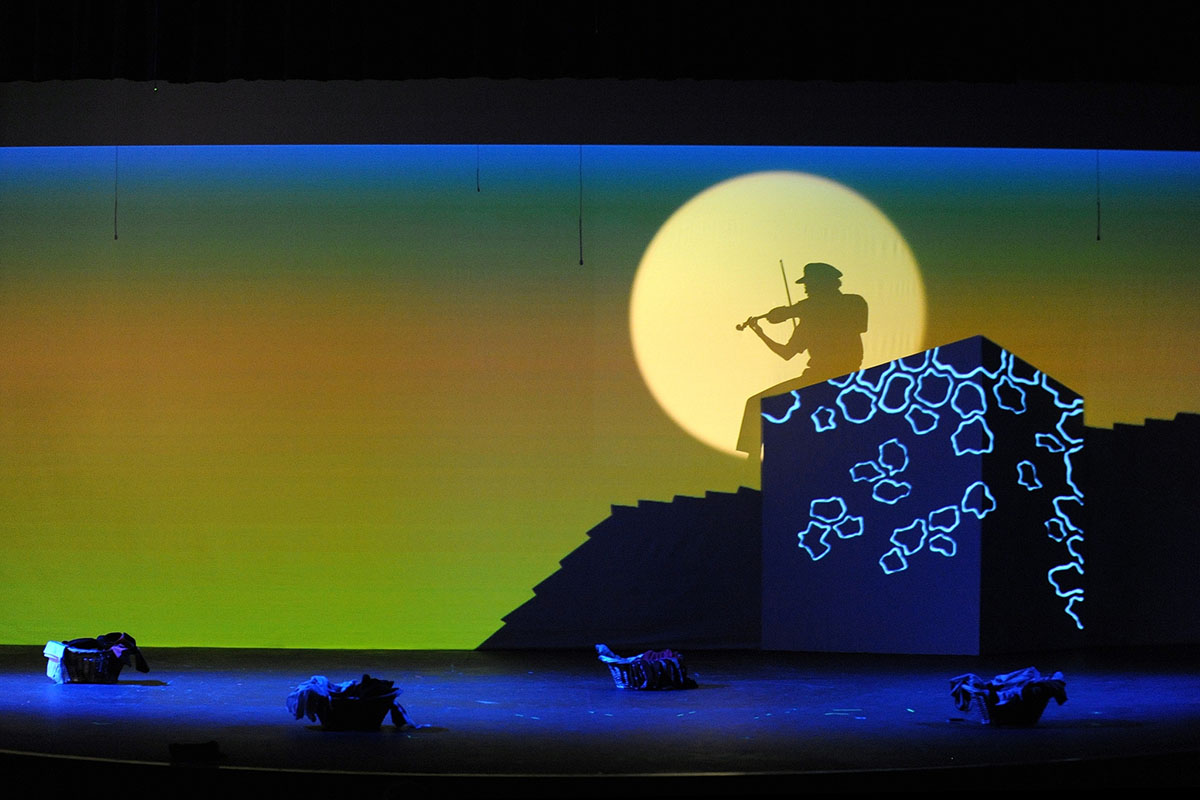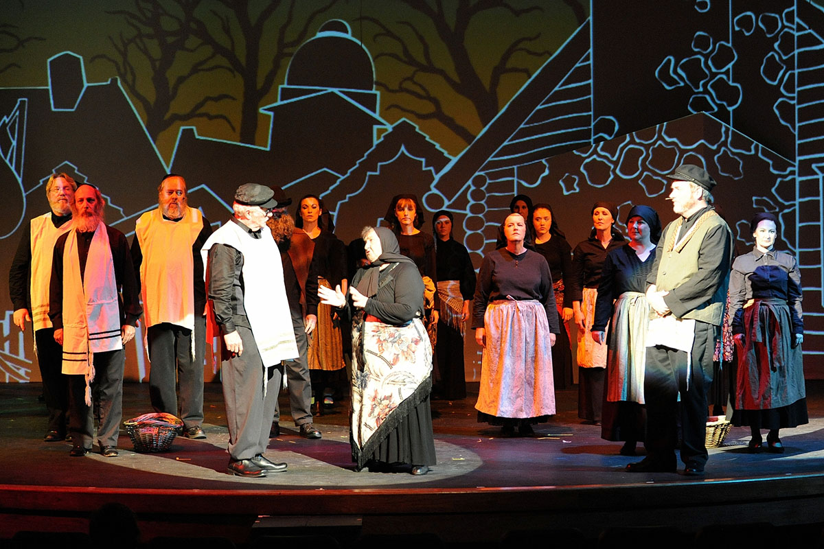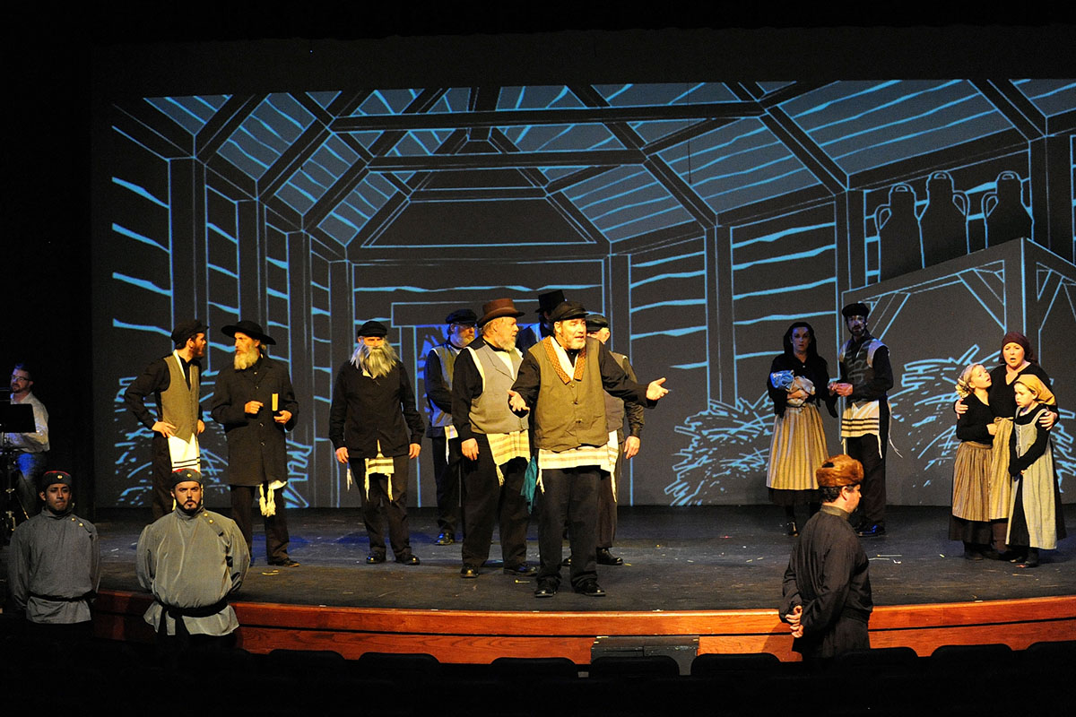 The set design for "Fiddler On The Roof" is entirely projections and back-lit silhouettes of actors onto a fabric cyclorama. The main scenic projections are from the front. In addition, a hard set piece "wedge" is positioned in front of the cyc to add dimension to the projection. Also, rear projection shows the sun and moon, silhouetting the fiddler. It was originally conceived for Music Theatre of Denton in Denton, Texas. The dimensional "wedge" becomes many things depending on what is projected onto it ... a chimney, a wood stove, a bed seen in a bird's eye view, a tombstone ... to mention a few. Depending on the position and projection angle of the front projection, the artwork will need to be adapted to work in other venues. It is possible to convert all the projection to be from the rear, with additional front projection for the "wedge." A totally flat version could be produced, not incorporating the "wedge." Contact Mr. Lamb to discuss how this property may be customized to your venue. The video below shows excerpts of most scene changes. Between this video and looking at the still images to the right, one should be able to get a sense of how the show looks. Click here for a review of the show in the Denton Record Chronicle. Click on the photos below to see larger images opened in a new tab. |